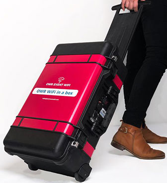 WiFi in a Box is portable, scalable, durable and easy to use. It comes with a handle that extends, as well as a side handle so you can carry the pelicase easily. We designed it to move with busy event planners, use it for coaches, cars, venas, trains and aeroplanes. Broadband for 100 users and coverage up to 40 metres that can be extended upon request? No problem! It comes with private SSIDs and complies with all WiFI security standards.